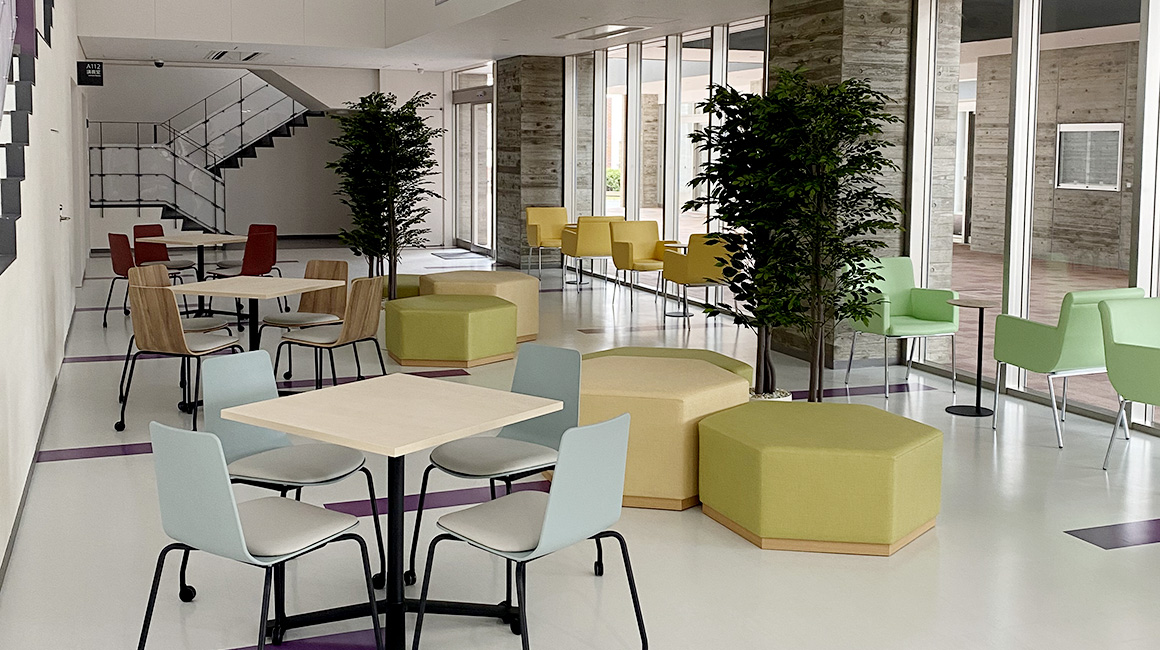 就実学園様の就実大学・就実短期大学新A館改築に伴い、地域社会の発展に寄与できる学生を育む「場」の構築に参加させていただきました。教員や学生、地域の方が交流・学習・協働・発信の場として活用できるよう、それぞれのアクティビティに合わせた家具をご提案いたしました。